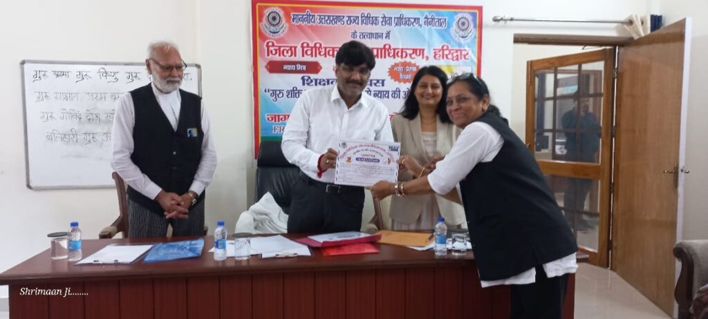 पंडित दिव्यांश शर्मा स्वतन्त्र पत्रकार हरिद्वार, 26 सितंबर 2025: उत्तराखंड राज्य विधिक सेवा प्राधिकरण नैनीताल के निर्देशानुसार जनपद न्यायाधीश अध्यक्ष, जिला विधिक सेवा प्राधिकरण हरिद्वार नरेंद्र दत्त की अध्यक्षता में दिनांक 25-09-2025 को जिला विधिक सेवा प्राधिकरण हरिद्वार के सभागार में न्याय प्रेरणा शिक्षक गुरु शक्ति न्याय शक्ति ज्ञान से न्याय की ओर अभियान के अंतर्गत प्राधिकरण द्वारा कार्यक्रम आयोजित किया गया।मुख्य अतिथि माननीय जिला जज नरेंद्र दत्त द्वारा स्कूल, कॉलेज, महाविद्यालय, विश्वविद्यालय और अन्य विभागों से आए समस्त गणमान्य व्यक्ति एवं शिक्षकगण को प्रमाण पत्र देकर सम्मानित किया गया। समाज में गुरुजनों का महत्व बताते हुए यह संदेश दिया गया कि गुरु के बिना इस जीवन में ज्ञान प्राप्त करना एक कठिन कार्य है तथा बच्चों के संपूर्ण विकास हेतु शिक्षा और न्याय दोनों ही महत्वपूर्ण अधिकार हैं जोकि हमारे शिक्षकगण द्वारा फलीभूत किए जाते हैं। इस अवसर पर कार्यक्रम के अंत में सचिव सिमरनजीतकौर द्वारा जिला विधिक सेवा प्राधिकरण हरिद्वार के अंतर्गत विद्यालयों में स्थापित किए जा रहे बाल न्याय क्लब व महाविद्यालय के अंतर्गत स्थापित व कार्यरत लीगल एड क्लिनिक के विषय में जानकारी साझा करते हुए अधिक से अधिक विद्यालयों में स्थापित करने का आव्हान किया और सभी का धन्यवाद ज्ञापित किया गया।