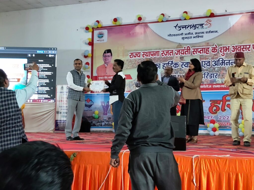 पंडित दिव्यांश शर्मा स्वतन्त्र पत्रकार हरिद्वार, 9 नवंबर – उत्तराखंड राज्य स्थापना की 25वीं वर्षगांठ के अवसर पर हरिद्वार में विभिन्न कार्यक्रम आयोजित किए गए। जिलाधिकारी मयूर दीक्षित ने विभिन्न क्षेत्रों में उत्कृष्ट कार्य करने वालों को प्रशस्ति पत्र देकर सम्मानित किया। इस अवसर पर जिला विधिक सेवा प्राधिकरण सचिव एवं सिविल जज सिमरनजीत कौर ने कहा कि उत्तराखंड राज्य स्थापना दिवस के अवसर पर जिला विधिक सेवा प्राधिकरण द्वारा राष्ट्रीय विधिक सेवा दिवस के तहत लोगों को विधिक जानकारी उपलब्ध कराई गई। उन्होंने कहा कि प्राधिकरण का उद्देश्य प्रदेश के प्रत्येक नागरिक को उचित न्याय प्रदान करना है।जिलाधिकारी मयूर दीक्षित ने कहा कि उत्तराखंड राज्य ने 25 वर्षों में कई उपलब्धियां हासिल की हैं। उन्होंने कहा कि प्रधानमंत्री और मुख्यमंत्री के कुशल नेतृत्व में देश और प्रदेश निरंतर प्रगति और उन्नति के पथ पर अग्रसर हैं। इस अवसर पर विभिन्न स्कूलों के छात्र-छात्राओं ने लोक कला और लोक संस्कृति पर आधारित सांस्कृतिक कार्यक्रम प्रस्तुत किए। विभिन्न विभागों द्वारा जनकल्याणकारी योजनाओं की झांकी का प्रदर्शन किया गया।कार्यक्रम में मुख्य विकास अधिकारी ललित नारायण मिश्रा, अपर जिलाधिकारी फिंचाराम चौहान, जिला विकास अधिकारी वेद प्रकाश, मुख्य चिकित्साधिकारी डॉ. आरके सिंह, मुख्य शिक्षाधिकारी आशुतोष भण्डारी, जिला पंचायतराज अधिकारी अतुल प्रताप सिंह, मुख्य कृषि अधिकारी गोपाल सिंह भण्डारी, मुख्य उद्यान अधिकारी तेजपाल सिंह, जिला अर्थ एवं नलिनी ध्यानी, सहायक निदेशक मत्स्य गरिमा मिश्रा, परियोजना प्रबन्धक उरेडा गंभीर सिंह बिष्ट सहित जनप्रतिनिधि, विद्यार्थी आदि मौजूद रहे।